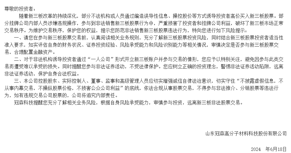 尊敬的投資者:隨著(zhù)新三板改革的持續深化,部分不法機構或人員通過(guò)編造誤導性信息、操控股價(jià)等方式誘導投資者高價(jià)買(mǎi)入新三板股票。部分掛牌公司內部人員涉嫌違規操作,參與到非法銷(xiāo)售新三板股票...